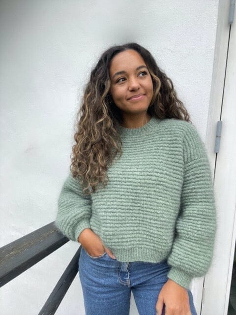 Sharpei Sweater is a soft and expressive sweater knitted bottom-up. Horisontal pleats adds structure to the sweater and the yarn is chosen carefully to get a light sweater. Chunky sweaters often gets a big heavy and droopy at the edges, but the yarn choice of Önling No 12 (cotton/wool) + Önling No 10 silk mohair adds both lightness and stability.
