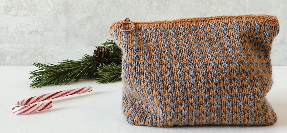 Slip stitch patterns refer to a group of patterns, that create beautiful structures or color patterns by the simple technique of slipping stitches from the left needle to the right needle, without knitting or purling them. By slipping stitches, you actually pull a stitch from the previous row up between the new stitches. If you do that while knitting with only one color, this can create interesting structures in your knitting project. However, the true magic happens when you change color between the rows. When you do that, slipping stitches (and thereby pulling stitches up from previous rows), makes it possible to create a whole range of beautiful color patterns, even though you only knit with one color at a time. Slip stitch patterns are therefore easier to knit, than the more complicated stranded color patterns such as fair isle. If you want to try a simple project with slip stitches in two colors, we can recommend the Slip Stitch Pepita Purse.