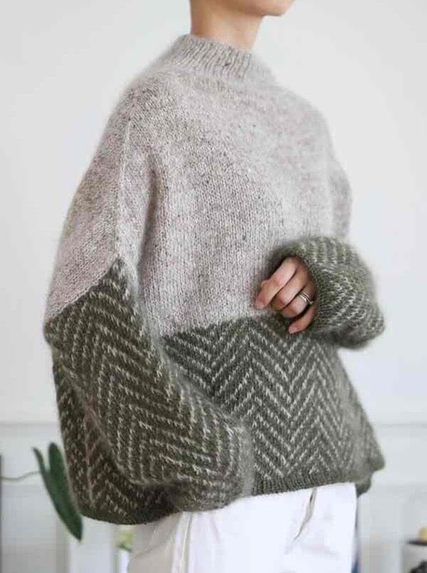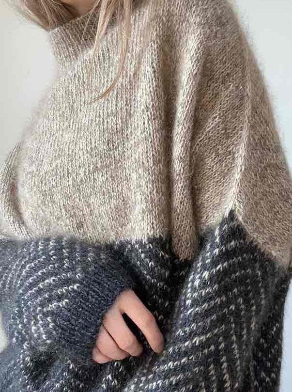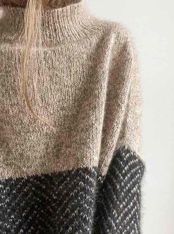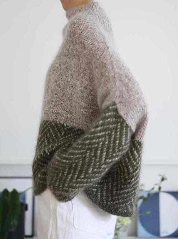 Jeol is Korean and means to bow for Buddha. The inspiration for Jeol came from the classic men’s coat with the herringbone pattern. The pattern is placed on the bottom of the sweater, in a colour in great contrast to the plain stockinette on the top. This is to underline the fusion between Scandinavian and Korean aesthetics which is the foundation of AegyoKnit.