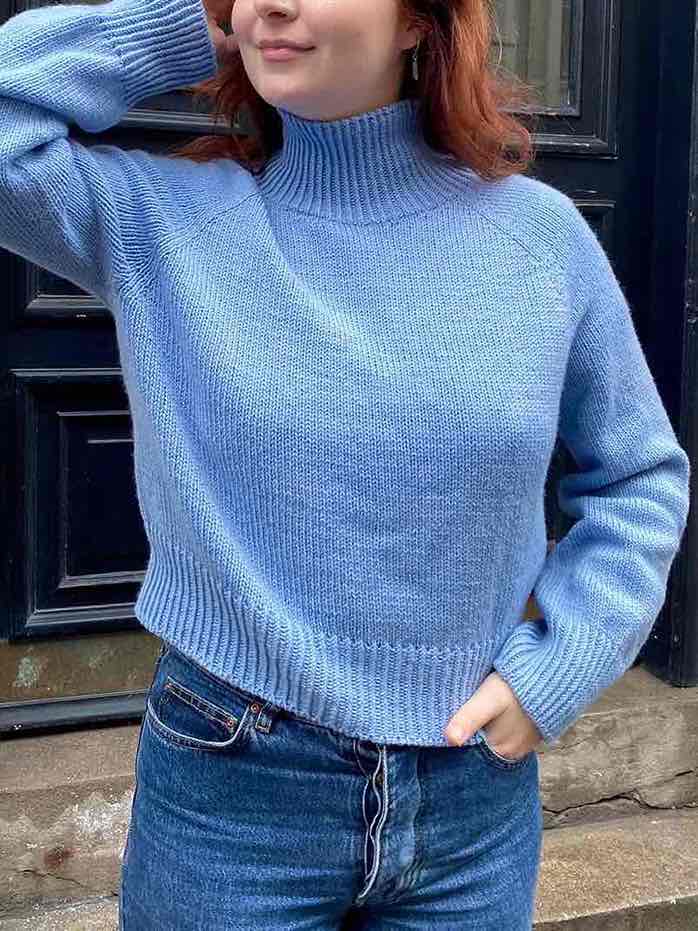 The Frederikke sweater is a basic and timeless high-neck raglan sweater, easy to knit—also for slightly experienced knitters. It has a classic fit with approximately 5 cm / 2 inches of ease, a normal armhole height, and long sleeves. The length is slightly short but can easily be adjusted to suit your style. A simple, versatile sweater that you will love to have in your wardrobe!