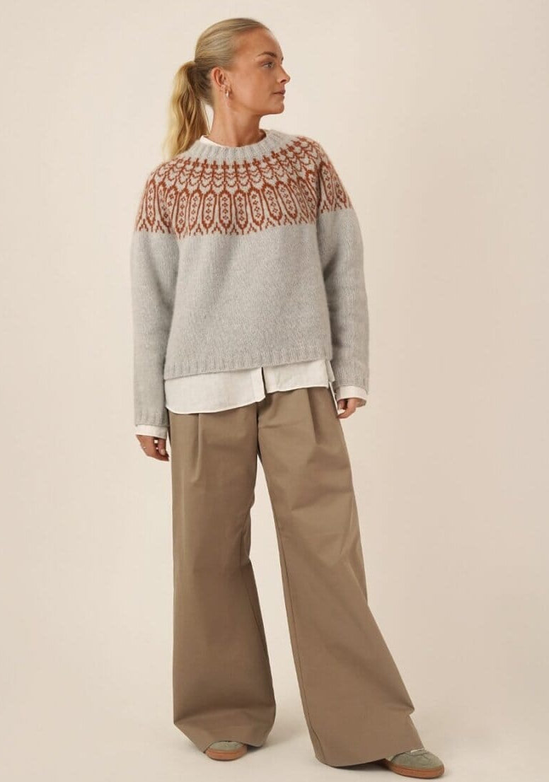 "Ger∂ur" is an Icelandic-inspired sweater with a pretty feminine pattern, inspired by flowers, decorative fair-isle details and a slightly oversize design. The sweater is worked in the round from the top down.