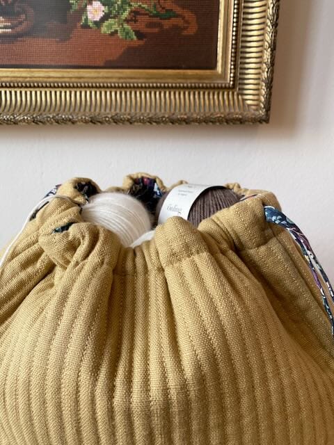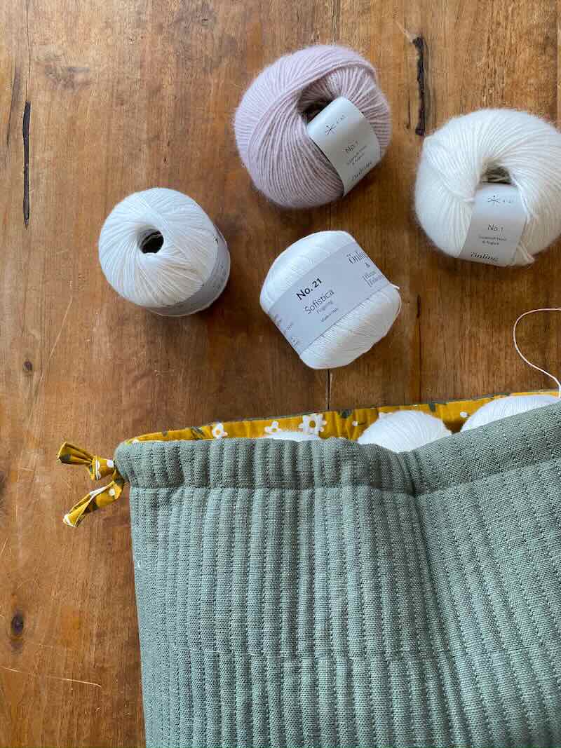The project bag is sewn from a durable woven cotton that has been quilted and then lined with Liberty fabric. All materials are GOTS certified - including the batting used for the quilting.