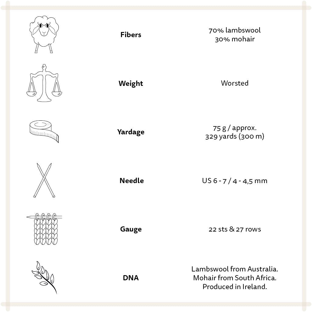 DNA of the yarn: Lambswool from Australia and mohair from South Africa. Produced in ireland, supporting responsible manufacturing and traditional knitting heritage.