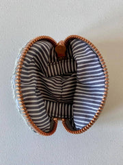 A small crescent-shaped purse to hold the tiniest knitting notions in your project bag, or coins or other small widgets in your purse. The included materials and notions are sufficient to make 3 small purses.