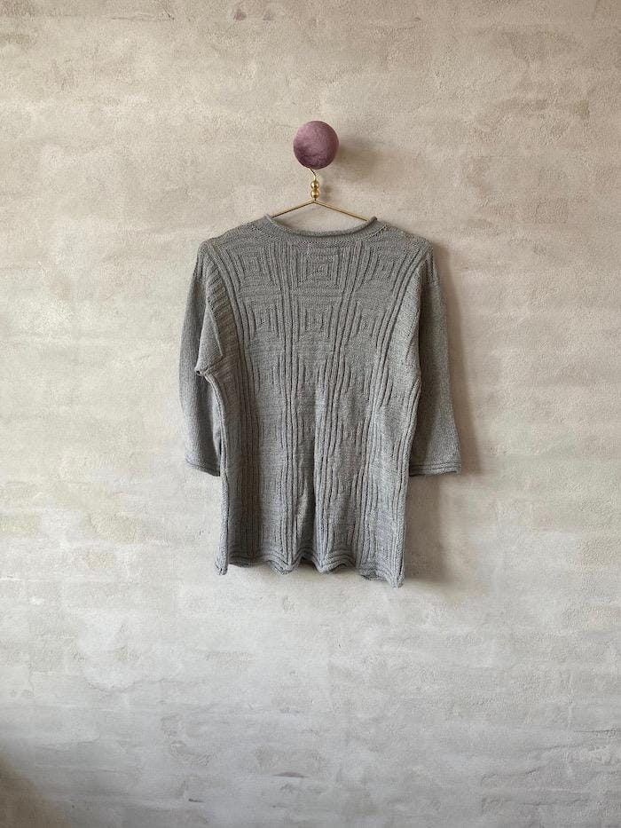 Back and forth are worked separate, and joined at the shoulders, where stitches are worked together before cast-off. Sleeves are worked partly in the round from the shoulders and down, 3/4 length or to desired length.