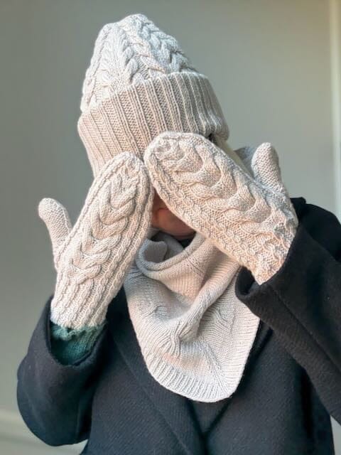 The decreases are integrated directly into the cable pattern, creating a calm and cohesive look and a smooth, rounded finish at the tips. The mittens are worked as mirror images, with the cables twisting in opposite directions to form a balanced and harmonious pair.