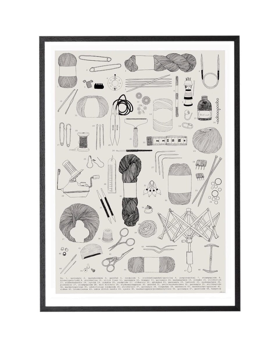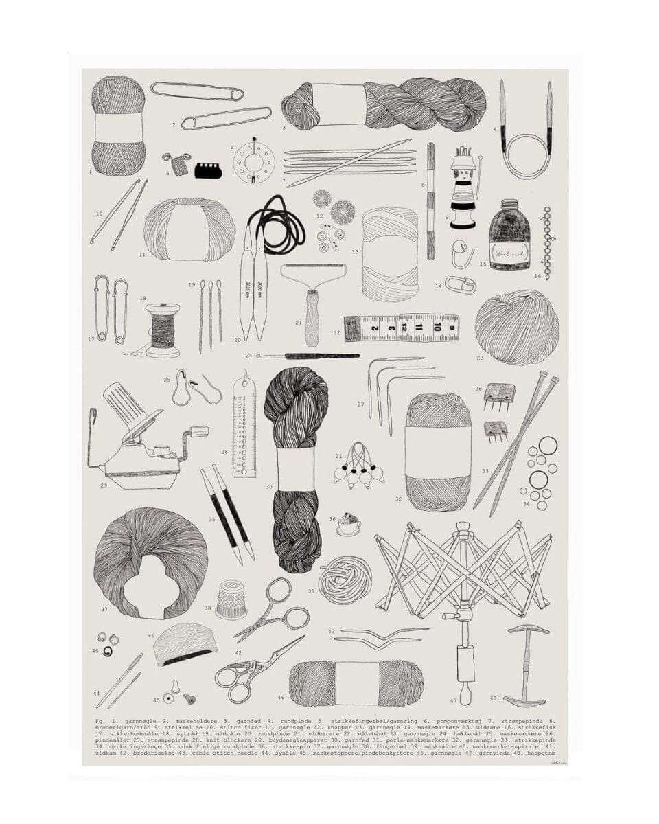 Rikke Rosenkrands is the illustrator behind this pretty poster, which is the first in a small collection called “For the love of knitting”. The poster shows a knitters many tools.