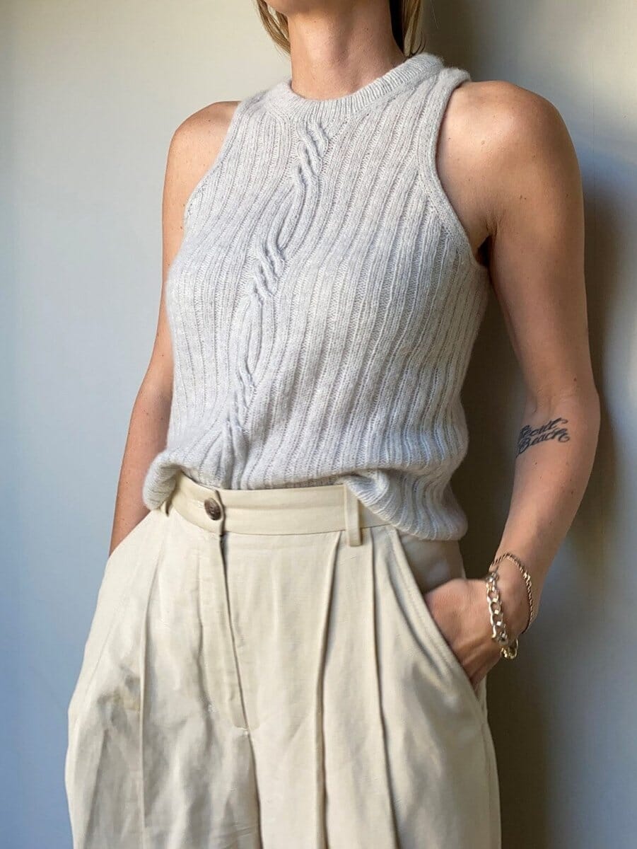 Twist Loop is a classic, rib knitted tank top with an elegant cable detail on the front. It has a unique expression with very elegant details that makes for a very satisfying knitting project.