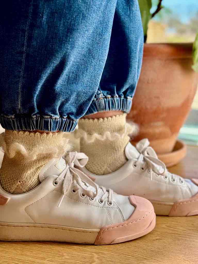 Idalina is a short, feminine sock featuring a picot edge and a ruffle to emphasize its delicate look. The sock is designed with a classic reinforced gusset heel and banded toe, ensuring a comfortable fit. It is knitted from the top down from the leg to the toe in stockinette stitch, and looks equally charming in sandals or sneakers – whether paired with shorts, a skirt, or cropped pants.