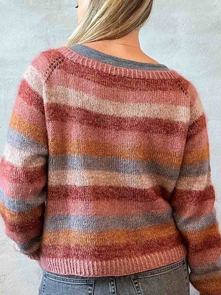 We knit Chloé sweater in 1 strand of our soft merino wool Önling No 4 held together with 1 strand of silk mohair. Combined you will get a wonderful fluffy yet light sweater, with a beautiful striped color mix from the silk mohair.