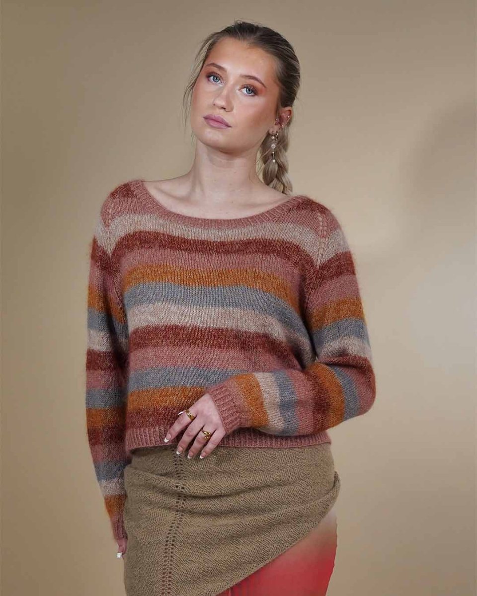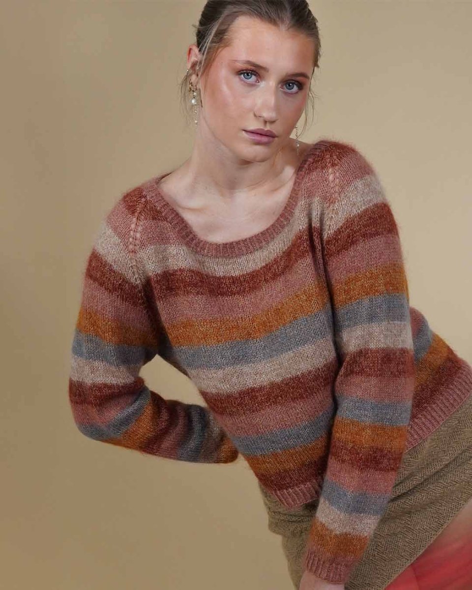 This is a wonderful, simple, striped raglan sweater in warm fall colors. It is made of one strand of Önling No 12, a wool and cotton mix, and various colors of silk mohair, giving the sweater a beautiful combination of colors. This sweater is light and warm in the comfortable way. The model is loose-fitting with a positive ease of approx. 10-15 cm / 4-6 inches. The design features fairly large armholes, and the pattern includes descriptions of both 3/4 and full-length sleeves.