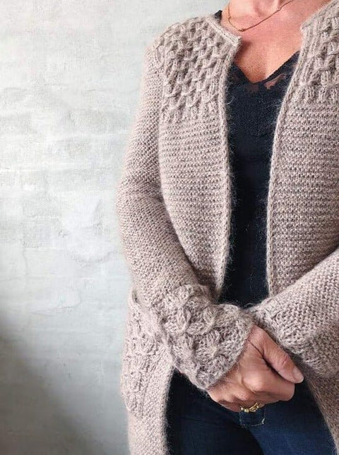 Beatrice is long, cozy cardigan with smock pattern at hem, sleeves and pockets.