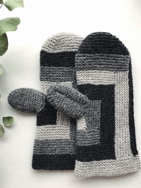 First knit a thumb, and from there you build up the mittens in modules, in the colors of your choice, until the width of the hand is achieved. Then knit the edge at the bottom, the top of the mitten and finally knit them together along the outer edge. The two mittens cannot be knit as complete mirrored copies, but they are the same in size!