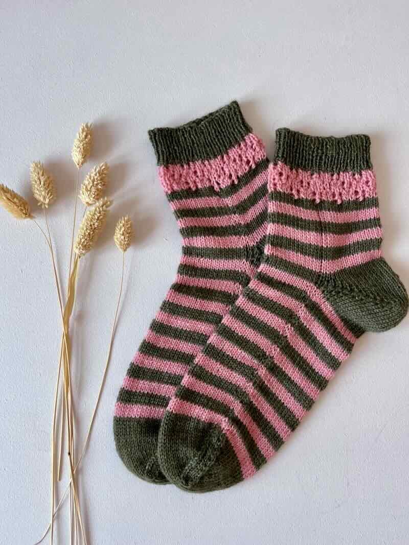 Isabella features a 1x1 rib, a sweet little lace pattern, striped stockinette stitch for the leg and foot, and a shadow wrap heel. We have worked Isabella in our soft and durable Önling No 18, which is made of 75% non-superwash wool and 25% recycled PET (plastic) from bottles.