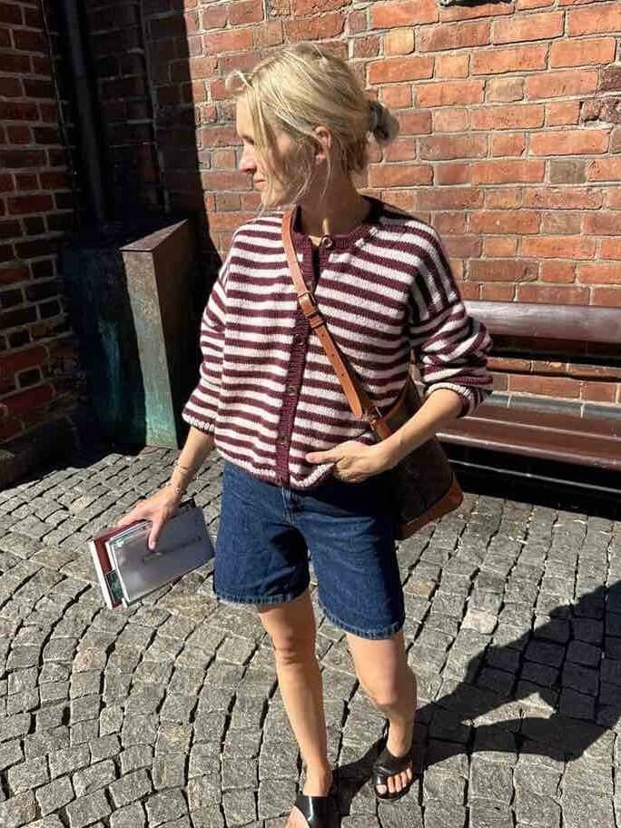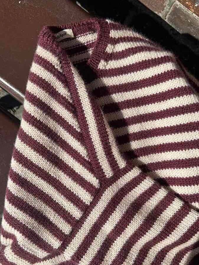 Olga Jacket is designed to have an oversized fit of approx. 23 cm [9 inches] positive ease. It is a light jacket, perfect for throwing on when you are on the go on an autumnal fall day. It features a button placket, rib edges and is knitted with stripes.