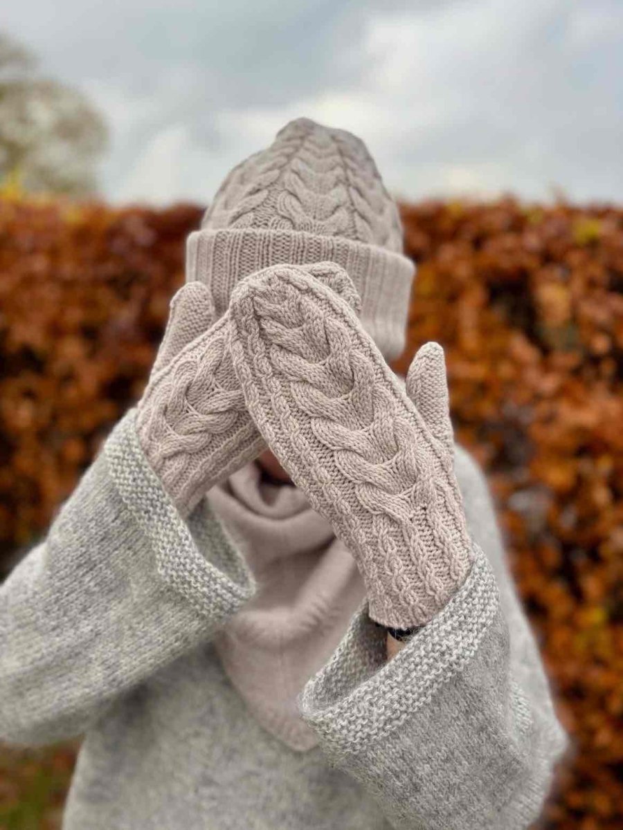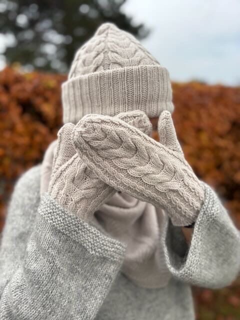The decreases are integrated directly into the cable pattern, creating a calm and cohesive look and a smooth, rounded finish at the tips. The mittens are worked as mirror images, with the cables twisting in opposite directions to form a balanced and harmonious pair.