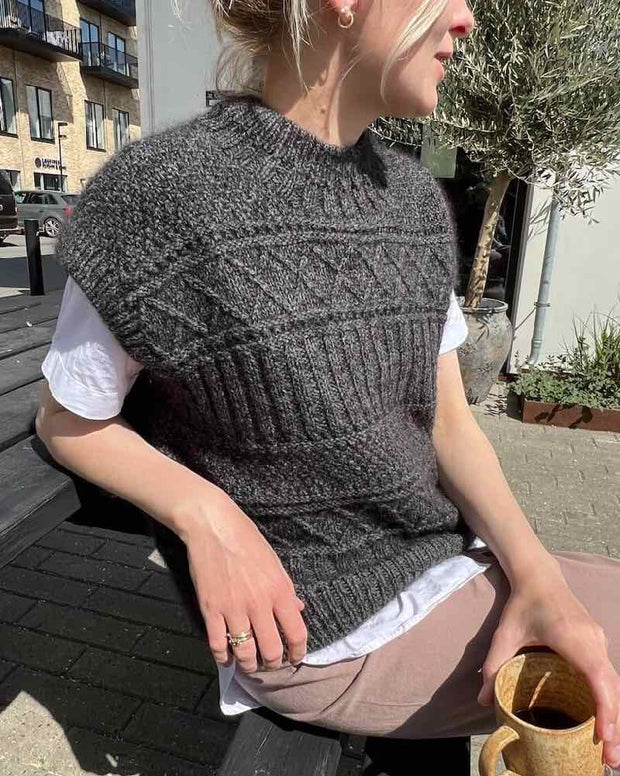 The Ingrid Slipover is worked from the top down in a knit and purl texture pattern. The Slipover is made up by on three different pattern sections, each one separated by an eyelet section. Here we work it in Önling No 1 for an ultrasoft and luxurious result.