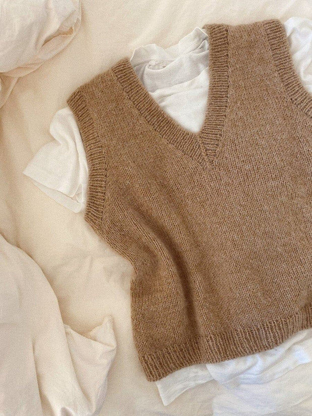 One of the big knitting trends this season is knitted vests. This classic version from PetiteKnit is a favorite of ours, with the same shoulder construction as the Stockholm Sweater with v-neck.