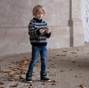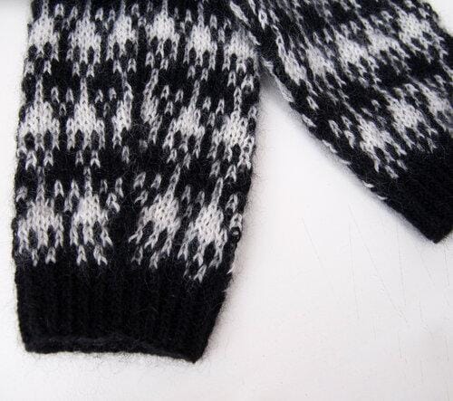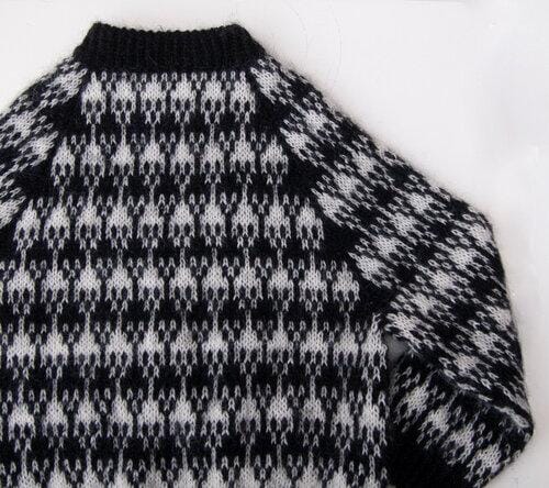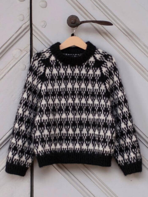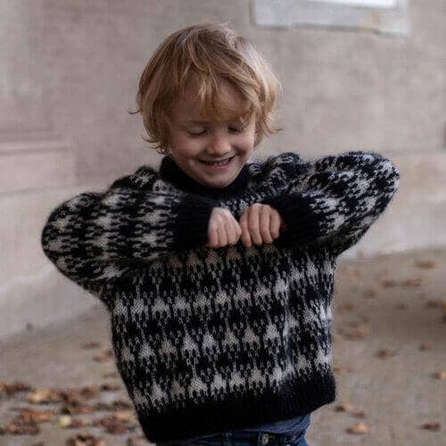 Wooly Roger is lovely soft sweater with a fun stranded colourwork pattern, twisted rib details and a soft, folded rib neck edge. The sweater is worked from the top down. The first part of the yoke is worked back and forth, while the neckline is shaped, then the work is joined in the round and the rest of the sweater is worked in the round. If you follow the instructions for the yoke carefully, the stranded pattern and the raglan increases become symmetrical and meet correctly at the armholes.