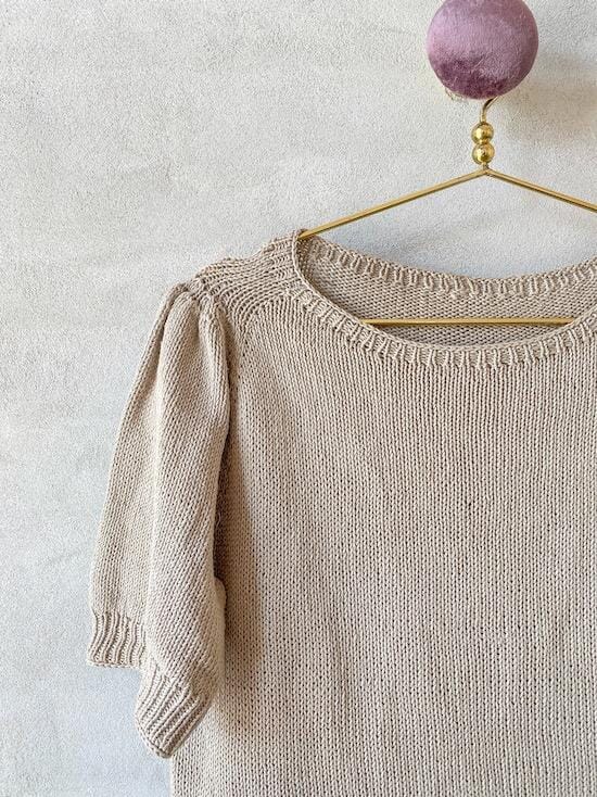 Summertime and sunshine invite bare arms and comfortable t-shirts! Paloma is both fun and fairly easy to knit and designed with puff sleeves. The t-shirt is worked in the round top down, and has a normal fit with a positive ease (over your measured chest) of approx. 5-8 cm / 2-3 inches.