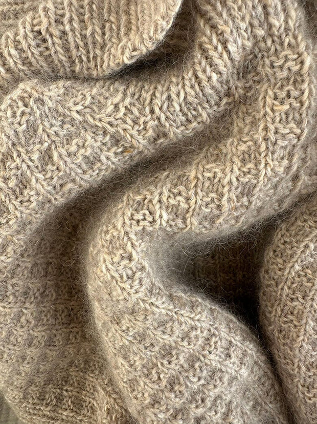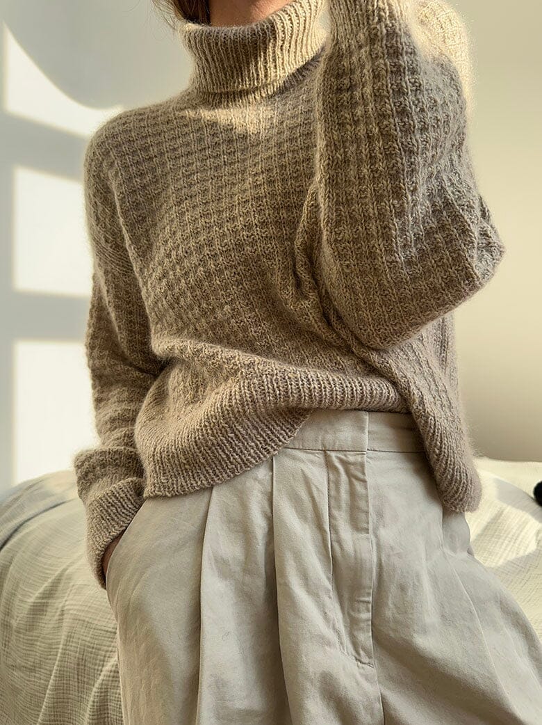 The sweater is worked top down. First, stitches are cast on for the neckline, which is worked flat in the waffle structure with rib stitches on both sides of the work. Simultaneously, the top of the back is shaped using increase, followed by picking up stitches along the shoulders. The shoulders are then worked flat and one at a time to later be joined for the front by casting on stitches. The front and back are joined and the body is worked in the round in the waffle structure with ribbing in the sides. The sleeve stitches are then picked up in the arm hole and the sleeves are worked in the round in the waffle structure and concluded with a ribbed cuff. Finally, stitches are picked up along the neckline to be worked in rib stitch and bound off using Italian bind off.