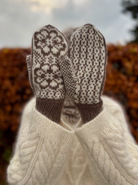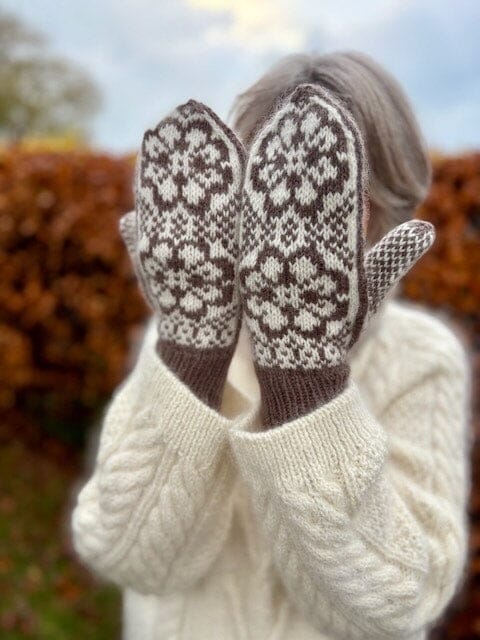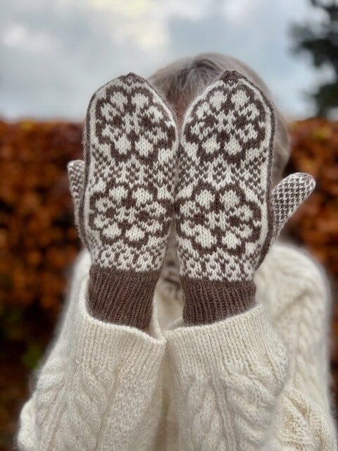 The Gaby Mittens are inspired by Norwegian mitten traditions and are adorned on the back of the hand with two eight-petal roses, as well as a palm pattern that also extends onto the upper side of the mitten. The mitten is knitted in two colors, giving you the opportunity to play with either calm, subdued shades or two colors with stronger contrast. The pattern creates an elegant, Nordic look that fits perfectly into a winter wardrobe.