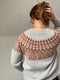 The sweater is worked in the round from the top down. First, the yoke is worked with short rows and increases, and then in the round with increases in Fair-Isle pattern. Finally, the piece is divided into body and sleeves, which are finished separately.