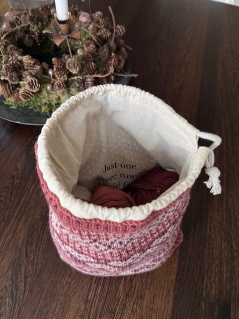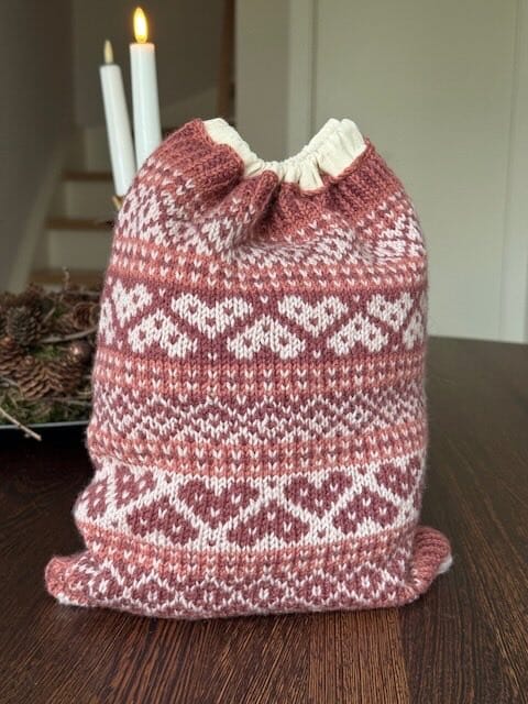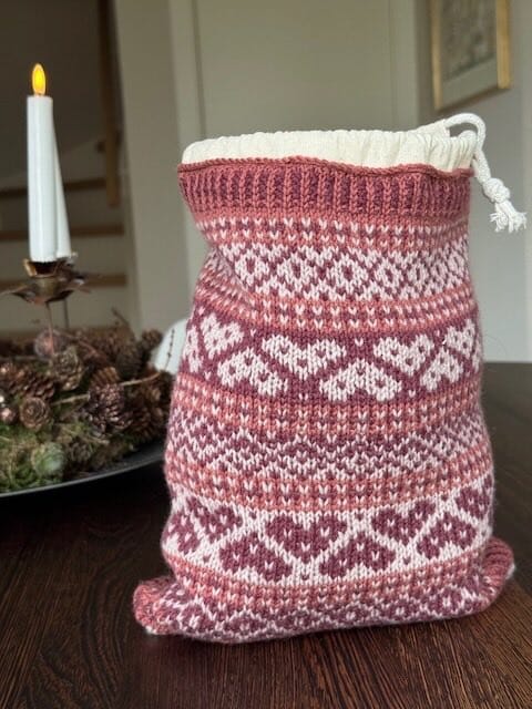 Gigi Knitting Bag is worked in the round in pattern and lined with a fabric drawstring pouch (not included in the kit), which functions as lining and the closure. The bag can be used for storing knitting projects and can hold 5–6 balls of yarn, depending on the thickness of the yarn. Gigi Knitting Bag is a manageable project, well suited for colorwork knitting in a smaller format.