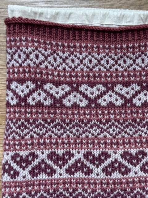 Gigi Knitting Bag is a knitted pouch worked in patterned knitting with an all-over heart motif, inspired by classic Fair Isle knitting. The pattern is constructed so that the placement of the colors is essential to the overall expression, and the design changes character when the colors are swapped.