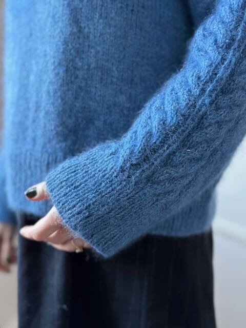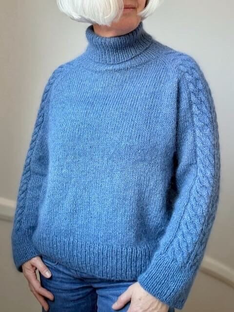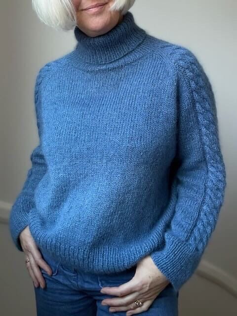 Simply Cable Sweater is an oversize raglan sweater with a turtleneck and a boxy fit. The neck is worked in rib and folded. The sleeves features a central cable which adds a unique touch to the sweater. Both sleeves and body are finished with wide ribbed edges.