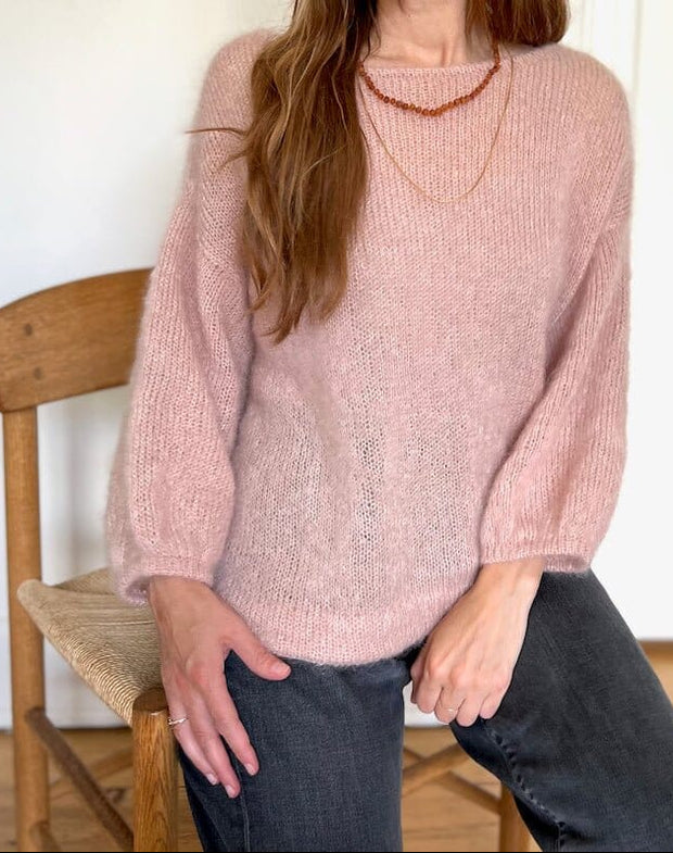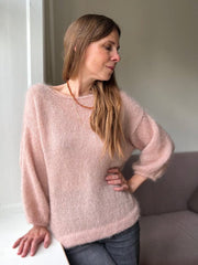 The pictured model is a size XS and has a positive ease on approx. 20 cm. It is knitted up in two strands of Önling No 10, color Dusty Rose 3628.