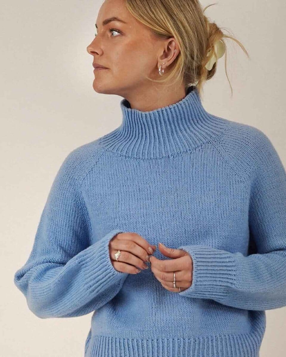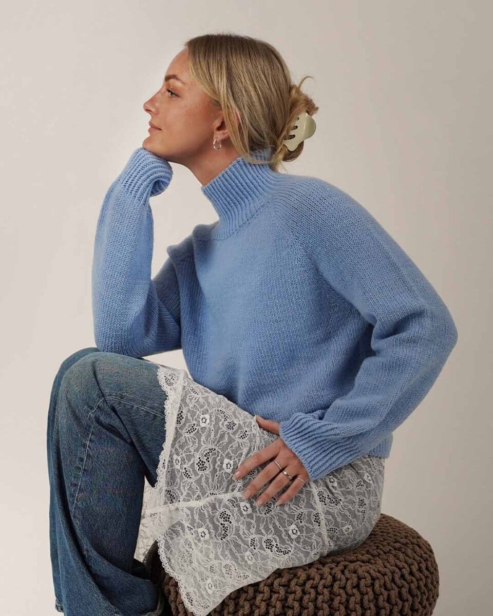 The Frederikke Sweater is a basic and timeless high-neck raglan sweater, easy to knit – also for slightly experienced knitters. It has a classic fit with approximately 5 cm / 2 inches of ease, a normal armhole height, and long sleeves. The length is slightly short but can easily be adjusted to suit your style. A simple, versatile sweater that you will love to have in your wardrobe!