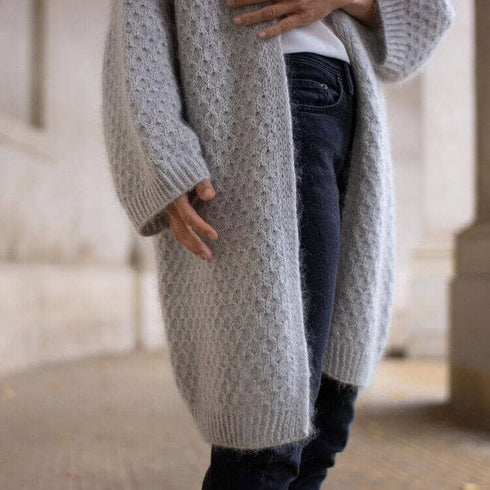 Cardi Cocoon is a soft and fluffy cardigan with a simple and elegant honeycomb cable pattern. The cardigan is worked from the top down. First the neck edge for the back of the neck is worked, then the back section of the yoke is worked down from there. After this, stitches are picked up along the back shoulders for the front sections of the yoke. The back and fronts are joined at the bottom of the armholes and the body is worked back and forth across all stitches to the hem. Finally, stitches are picked up for the sleeves along the armholes and the sleeves are worked in the round to the cuffs.