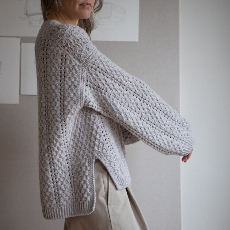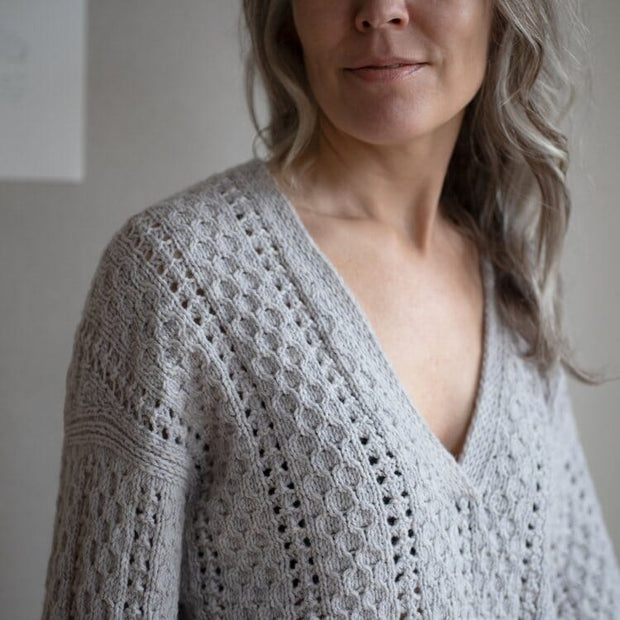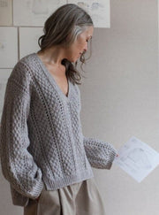 Comma V-neck is a feminine, oversized sweater with an elegant cable and pointelle pattern. The sweater is worked seamlessly from the top down.