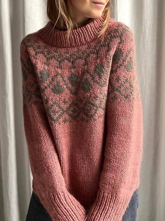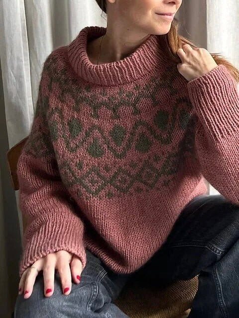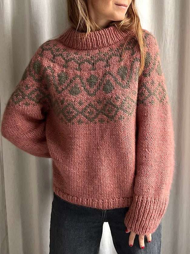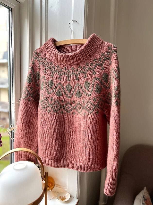 The Cor Sweater Chunky is a seamless Yoke sweater with a simple and light Fair Isle pattern. The pattern is worked only on the front side, using only 2 different colors, and there are at most 6 stitches in the same color at a time, eliminating the need for long floats on the back side, that require sewing.