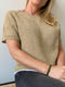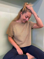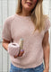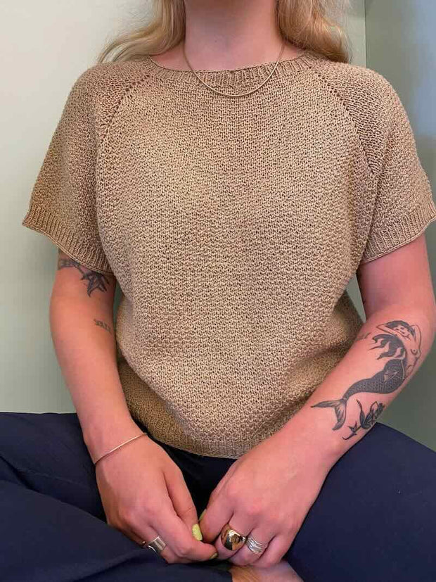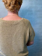 The t-shirt is worked in a simple stitch pattern, which results in a pretty structure. It is easy to knit, top-down, which lets you fit the sweater to your measurements as you go.