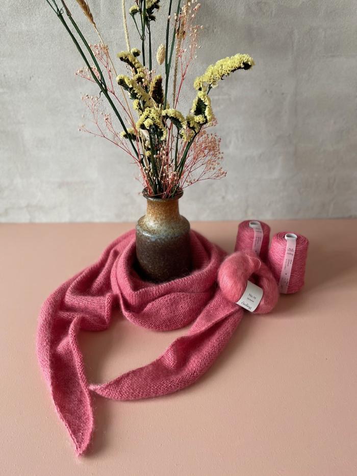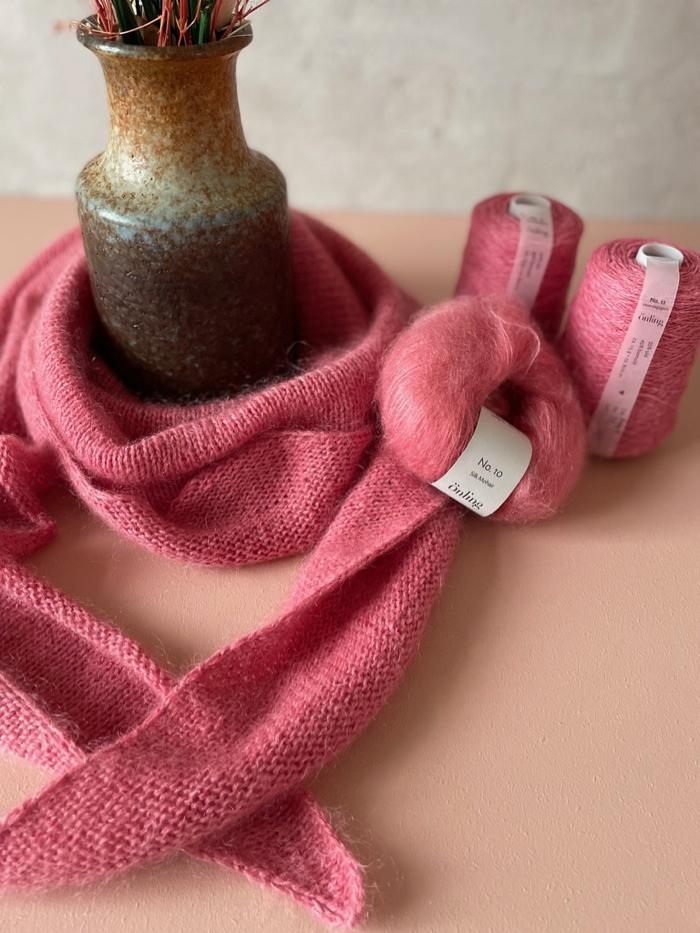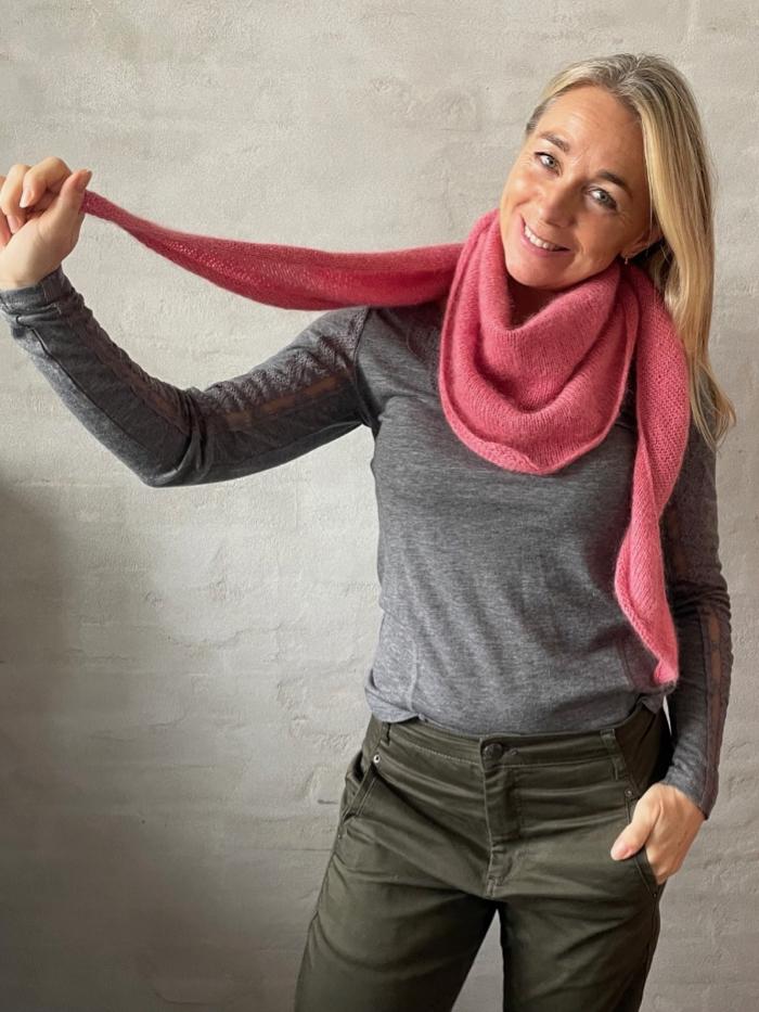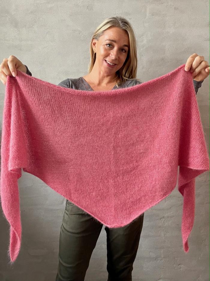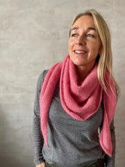 The scarf is worked back and forth in stockinette stitch, starting from the tip and increasing upwards. You begin by casting on 3 stitches and then continue increasing at the beginning and end of every row until you have 15 meters (20 yards) of yarn left or the scarf has reached the desired size.