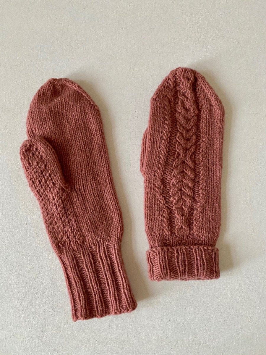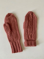 Procedure: The mittens are worked in the round from the wrist upwards. You start with a rib cuff and continue in stockinette, with many cables on the back of the hand, straight stockinette on the palm, and ‘false cables’ on the thumb. Stitches are set aside on a piece of yarn for the thumb before finishing the mitten. The ‘false cables’ on the palm side are continued on the thumb. Finally, the thumb stitches are picked up again, and the thumb is worked.