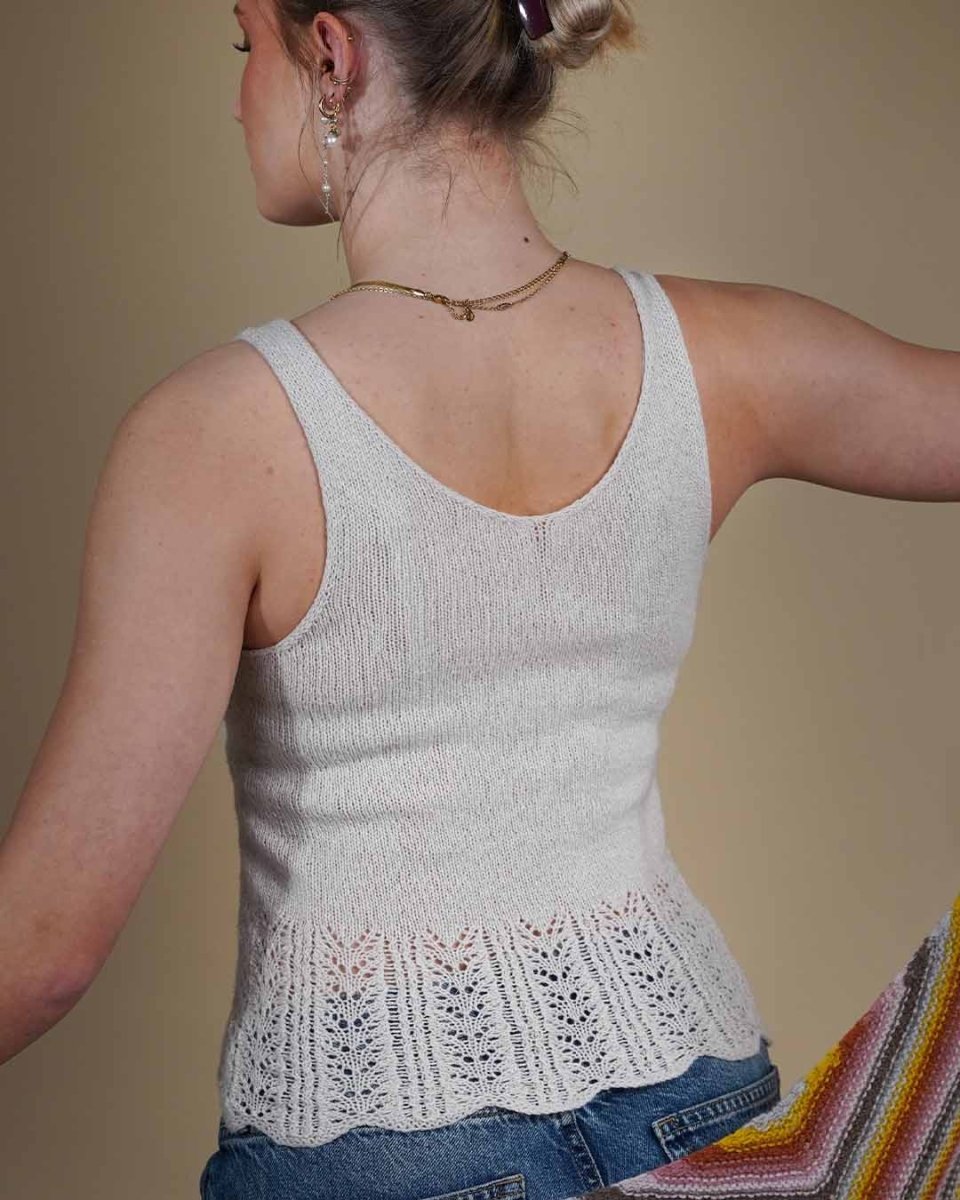 Fryd top is a tank top that can be used a a light summer top - or as a slip-over or vest, styled with a shirt or T-shirt in the winter. The V-neck top is knit in the round in lace pattern from the bottom up. Then proceed in stockinette st up to the armhole and finish off with i-cord. The pretty lace pattern creates a beautiful wave hemline.