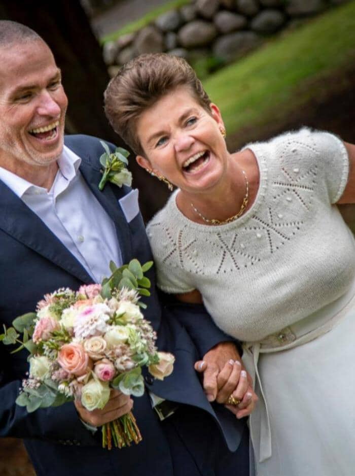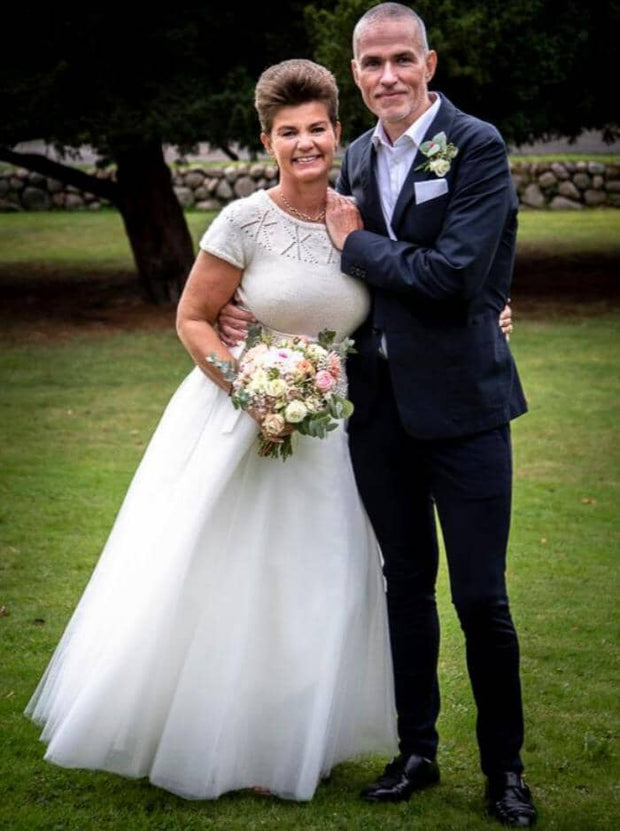 On September 26, 2020, Katrine was married for the second time. She had turned 50, and wanted both a church wedding and to be married in white, but in a more downplayed way. Her first wedding, when she was 27, was a ‘princess wedding’ with her wearing a magnificent dress, lace, veil, and a long train, so she had already tried that. This time she wanted to look good and feminine without too many frills, and she wanted to knit my own top. She managed to find the most beautiful, 5-layered tulle skirt – it had been used by another bride, and her girlfriend helped me shorten it (we took almost 50 cm off the length) to make it fit her. The top was to be made of 100% cashmere from one of our Italian suppliers. She wanted it to be simple, with a symbolic lace pattern.