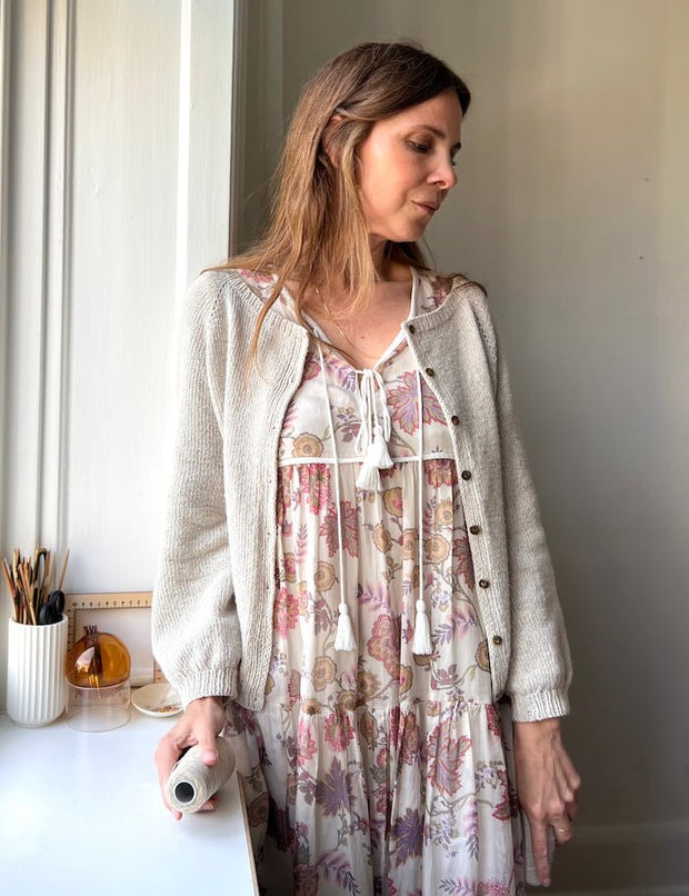 Nigrum Cardigan is a feminine raglan cardigan with a wide neckline and discrete balloon sleeves. The cardigan is knit top down, so you can easily adjust the length at both the body and sleeves while knitting. By knitting short rows, the neckline is slightly higher at the back. The cardigan is supposed to be worn with approx. 0 -10 cm positive ease.