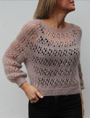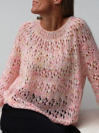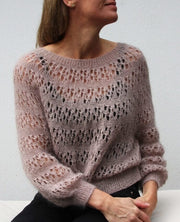 It is knitted top down in either one thread mohair or with one thread cashmere and mohair. It is knitted with lace pattern. This sweater is assembly-free.