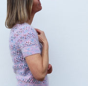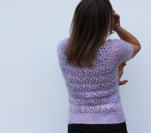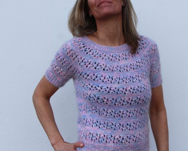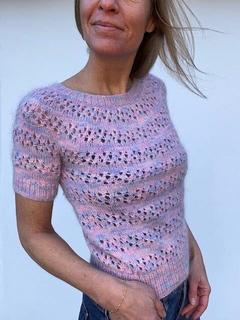 VesterbyCrea.No.28 is a light short-sleeved t-shirt worked in a feminine lace pattern. The model is worked top-down. The sweater is assembly free.