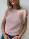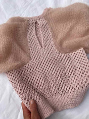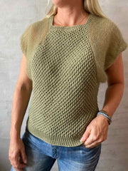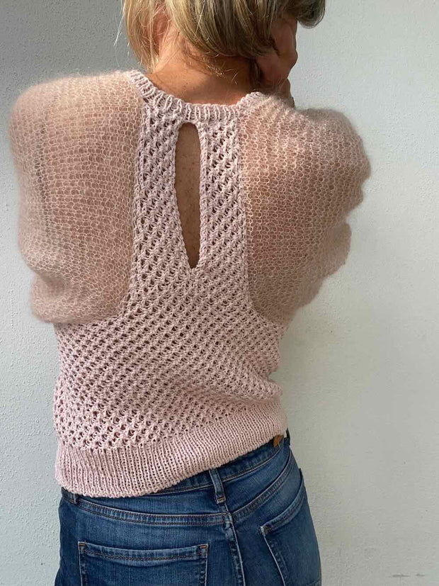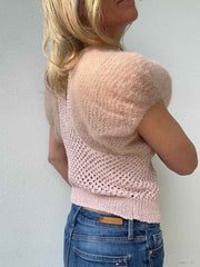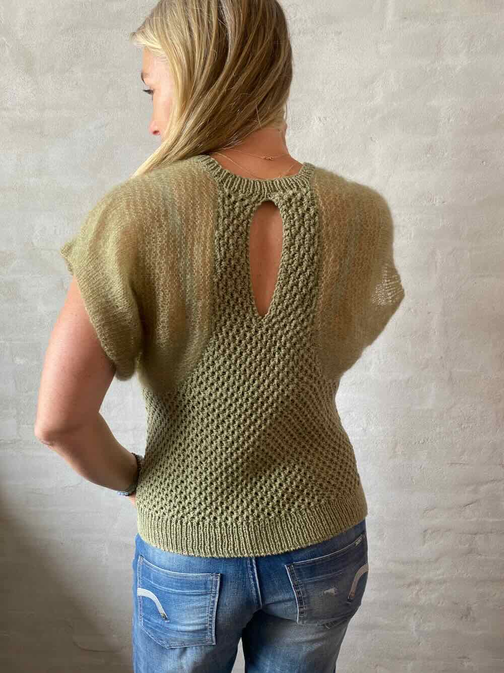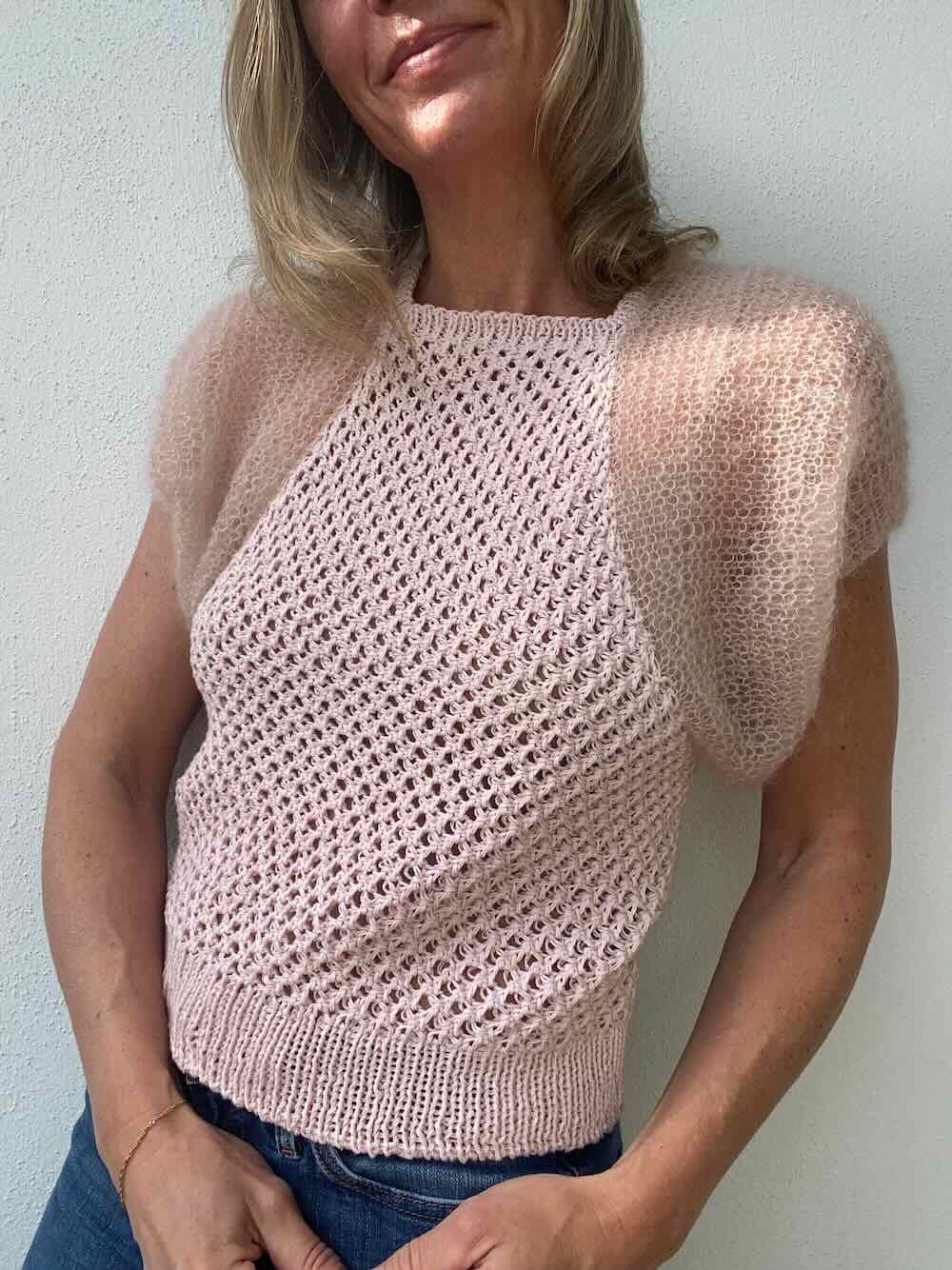 No 43 top is a stunningly beautiful summer top knitted with structure knitting on the body and short sleeves in garter stitches. The contrast between the cotton/linen yarn on the body and the added mohair sleeves gives the top a lovely and feminine touch!