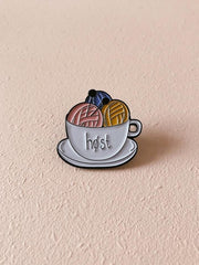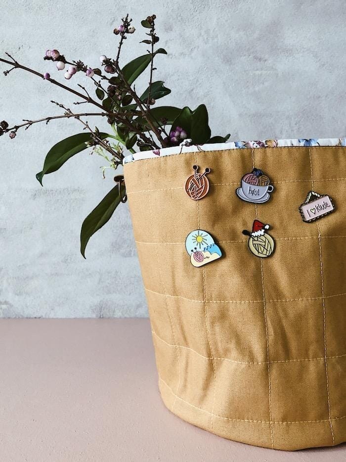 More "knitting-luxury" from Önling - a fun and pretty pin for your project bag, the pin is designed for our harvest knitting box, with a cozy cup of tea, yarn balls and knitting needles.