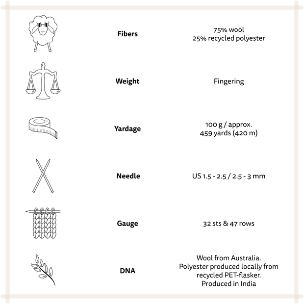 The DNA of the yarn: Wool from Australia and polyester produced locally from recycled PET-flasker. The yarn is produced in India