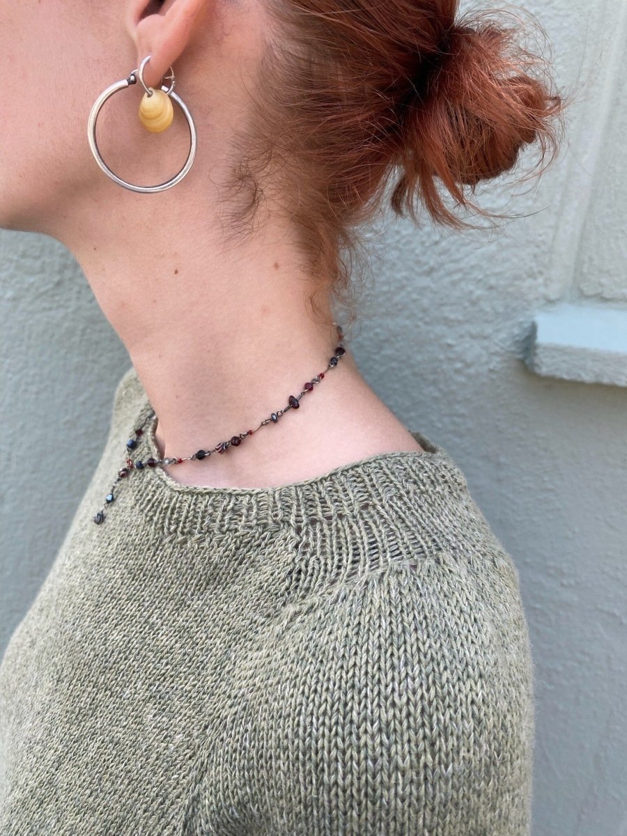 I imagine this t-shirt will fit perfectly with a long, flowery skirt, bare feet in flip-flops, and a summer hat. It is fun and fairly easy to knit. We knit it here in an OEKO-TEX certified cotton and linen blend, Önling No 21, together with a accompanying thread Önling No 13, which is a thin wool / cashmere blend. A wonderful summer blend!