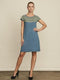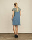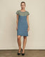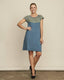 This dress is knitted from the top down, in the round. Firstly the yoke with stripes and increases in the collar is knitted. Hereafter you divide the work, to finish sleeves and body separately. The waistline is shaped by increases and decreases, and the dress ends with a sweet, ragged finishing edge.