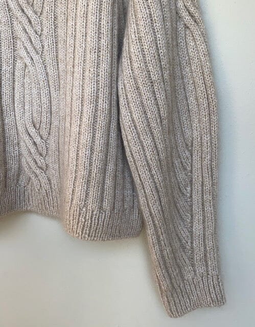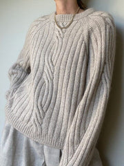 The sweater is worked in the round from the top down. After having finished the neck hem, you will work short rows to form the neck opening and continue in rib stitch, making raglan increases on the yoke and cables on the body and sleeves. The sleeves are shaped with a sequence of increases and finished with a rib hem.