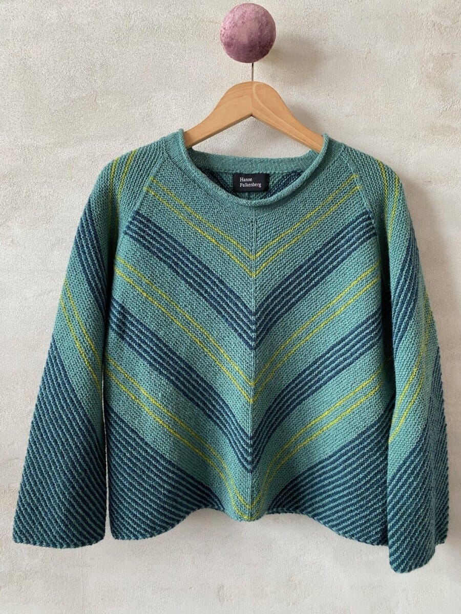 Vivi is worked in garter stitch back and forth without side seams. Stitches for sleeves are picked up along the armhole of the sweater.